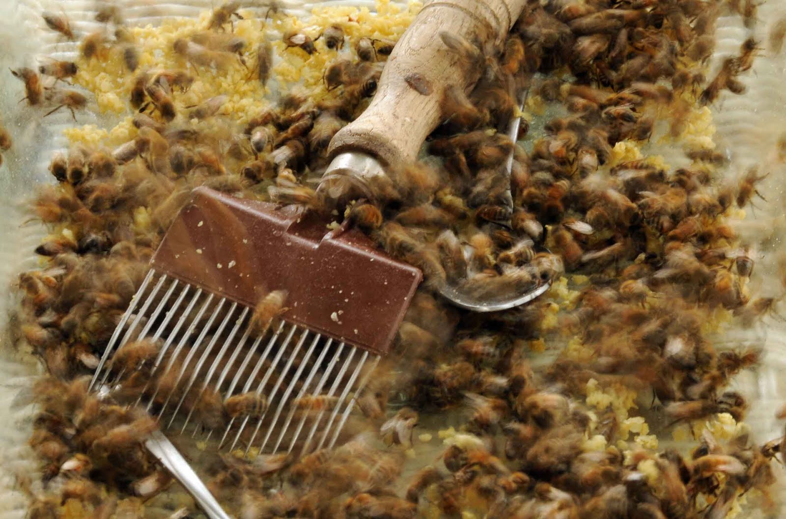 A bee mosh pit in the top strainer pan. You can see the bits of wax as they dig into the pile to make sure not a drop of honey is missed.